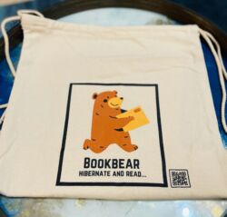 Bookbear loves his goodies! This is the first of those.. A branded canvas drawstring bag!