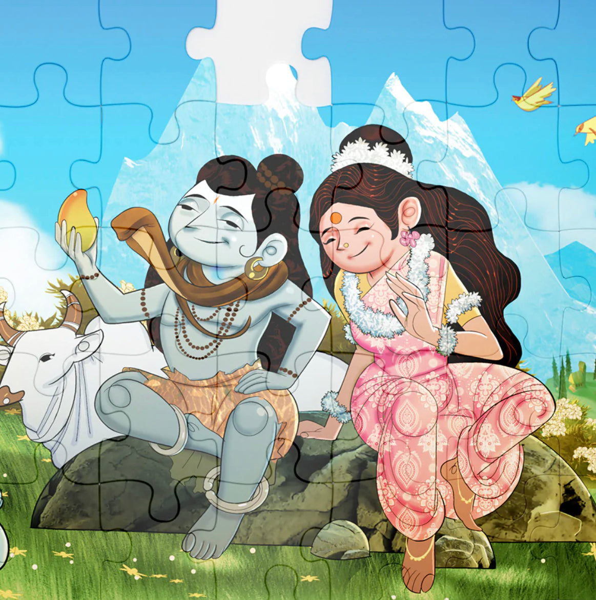 The Little Deities Collection of puzzles by Aurva, has been designed for children to discover and relish the unique stories of child deities from Hindu Mythology. This puzzle unfolds the tale behind Ganesha’s smart victory over his brother Karthikeya. Children explore the challenge set for them to go around the world and learn meanings of the world, love and devotion.