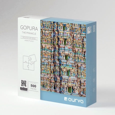 Gopura – The Pinnacle is a 500 piece jigsaw puzzle that is part of the 'Aurva - Architecture Series'. The puzzle features the magnificent Gopurams (Temple entrance towers) from the South of India. This puzzle provides playful opportunities to explore the architectural features, cultural attributes and artistic skills of the sculptors from the 12th Century.