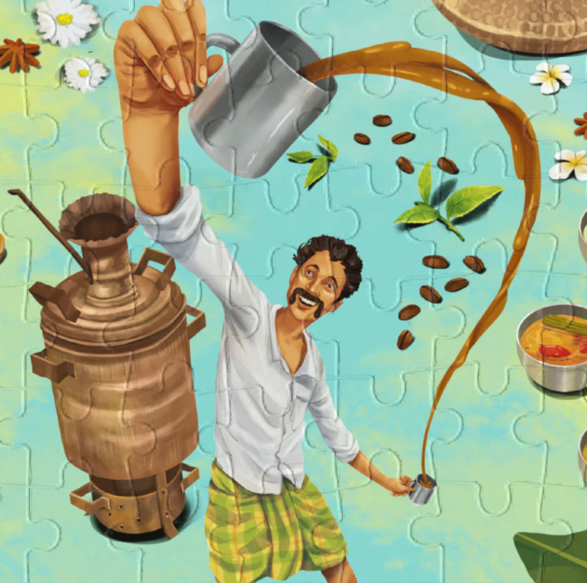 The 300 piece puzzle "Melting Pot" explores the myriad of spices, flavous, aromas, native ingredients that spew magic into the exotic, lip-smacking cuisine from the South of India. From the everyday breakfast varieties to the occasion-specific festive dishes and from the spread of dishes over lunch to the unparalleled fish and chicken curries, we bring to you an array of aromas! Tingle your taste buds as you decode this age old cuisine from the South of India!!!