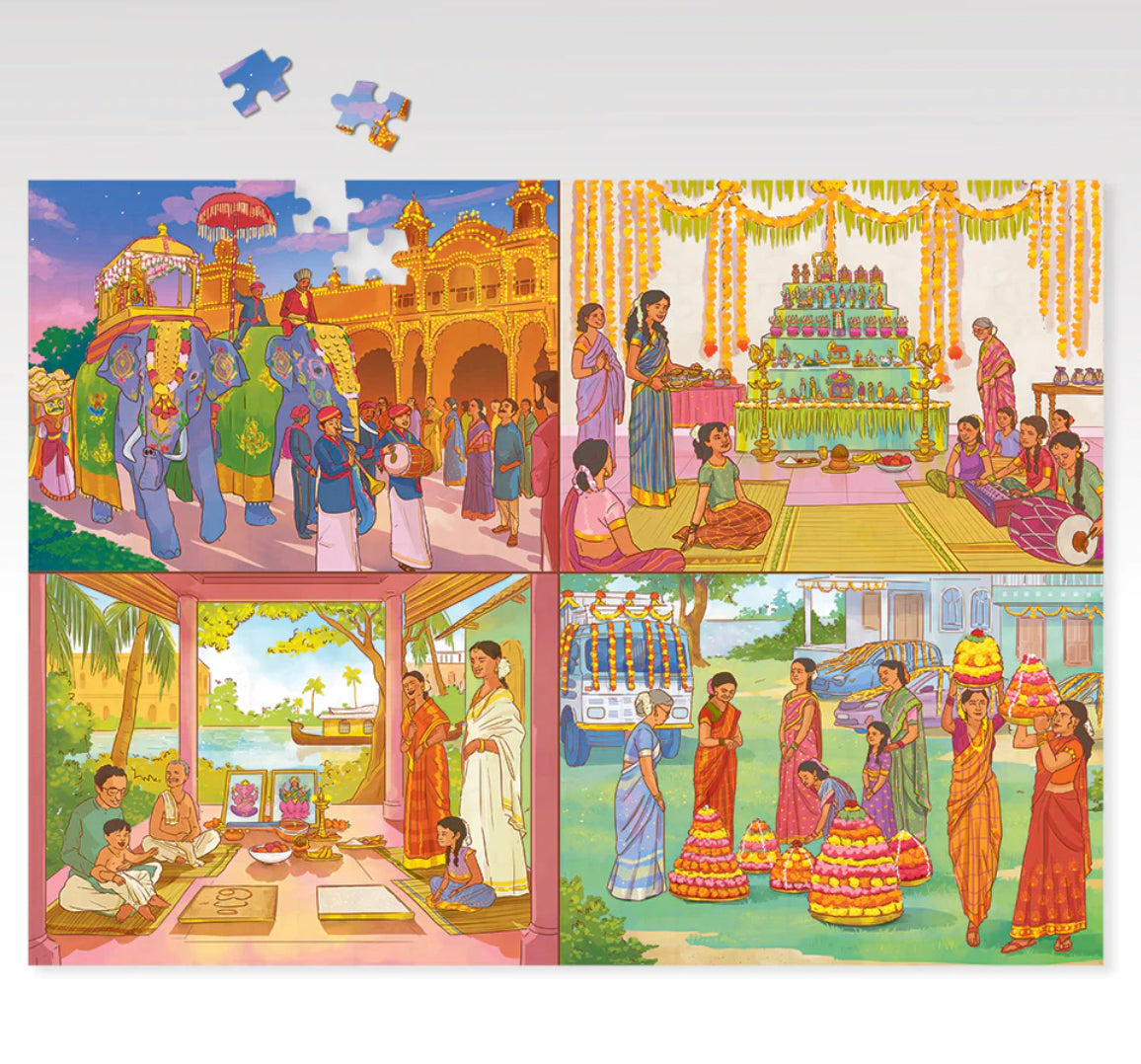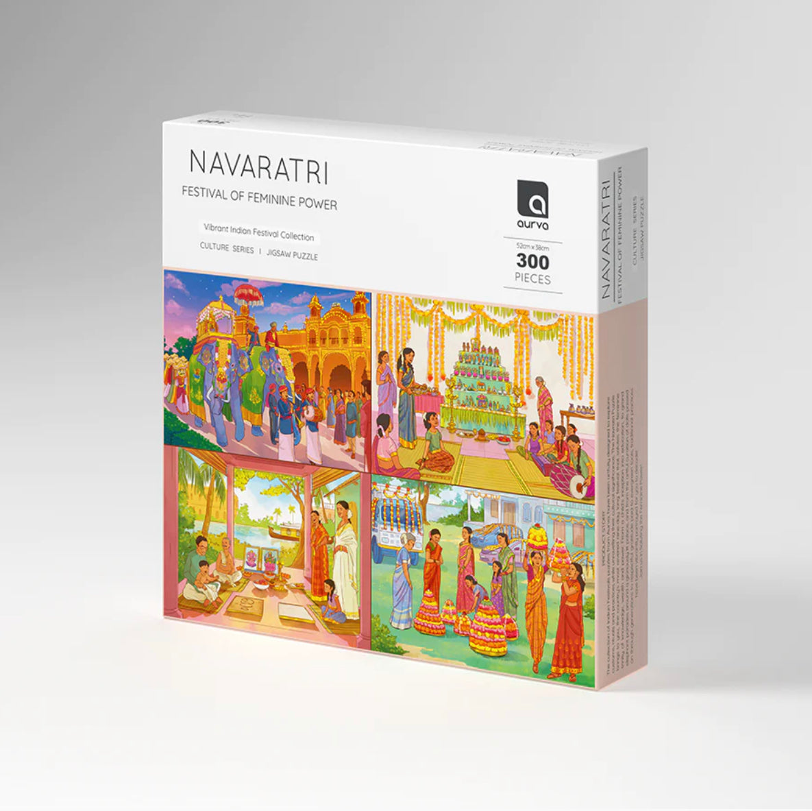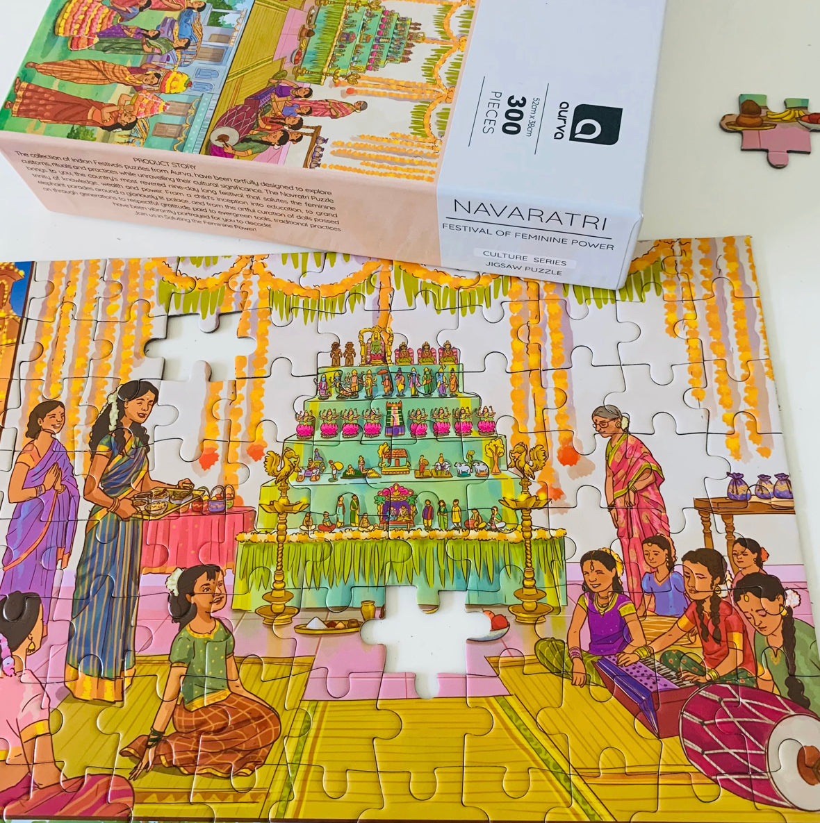 The collection of Indian Festivals puzzles from Aurva, have been artfully designed to explore customs, rituals and practices while unravelling their cultural significance. The Navratri Puzzle brings to you, the country’s most revered nine-day long festival that salutes the feminine trinity of knowledge, wealth and power. From a child’s inception into education, to grand elephant parades around a gloriously lit palace, and from the artful curation of dolls passed on through generations to respectful gratitude paid to evergreen tools, traditional practices have been vibrantly portrayed for you to decode! Join us in Saluting the Feminine Power!