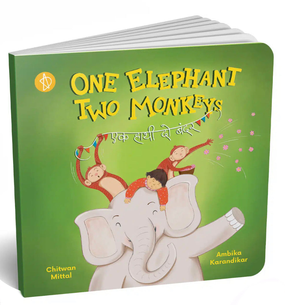 One Elephant, Two Monkeys is a bilingual (Hindi and English) book that introduces children to numbers, animal names and colour names through a little boy’s adventures with his animal friends. It can be read aloud to toddlers and preschoolers (2–4 year olds) or used to