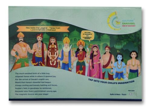 Tap into children's imaginations as they discover and explore stories from Lord Krishna’s childhood. Engage your little ones by reading tales of Lord Krishna to them and encouraging them to recreate the stories using YUG x Culture Carousel's vibrant and beautifully illustrated backgrounds and magnetic features. This product will enhance children's creativity, fine motor skills, independent thinking and story-telling skills as well as cultivate a love for Indian culture. Get set to connect with your young learner and enjoy hours of imaginative fun. This box includes 4 magnetic boards and 27 magnets along with the story and character list.