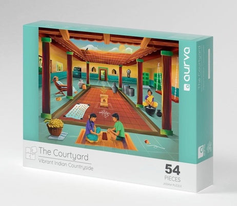 'The Courtyard' jigsaw puzzle is part of the 'Aurva - Lifestyle Series'. The puzzle unfolds the stories from Ammu’s and Cheenu’s visit to their native village during the summer holidays. Here, the children explore the everyday life around the courtyard at Grandma’s home while understanding the underlying meaning of the traditional practices . We hope that you have fun exploring and unravelling the hidden stories. We wish that the puzzles become a common point of exchange, engaging parents, grandparents and children, while reminiscing and rejoicing the treasured memories.