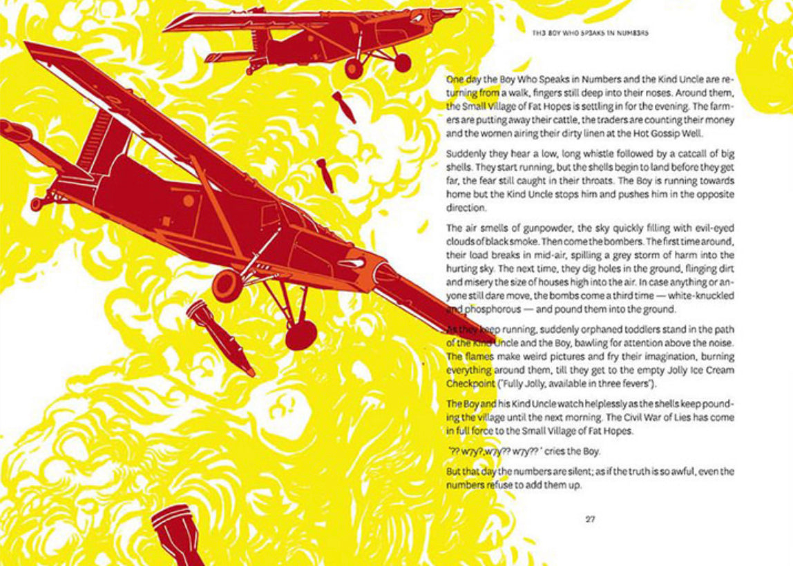 The Boy Who Speaks in Numbers is a darkly satiric account of childhood in times of war. Set in Sri Lanka, the events it narrates could equally happen elsewhere — in all places where human deaths are reduced to numbers and guns do not differentiate between adults and children. Mike Masilamani’s ironic narrative centres around an unnamed boy, who is at home with numbers rather than words. Along with a constantly chattering — and prophetic cow — he bears witness to a bizarre and violent time. UK-based illustrator Matthew Frame’s textured illustrations are a powerful testimony to the horror of prolonged civil strife.