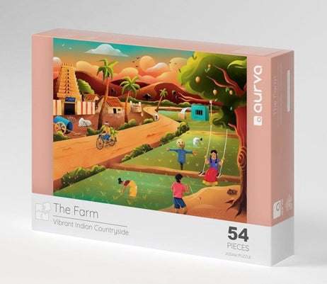 'The Farm' jigsaw puzzle is part of the 'Aurva - Lifestyle Series'. The puzzle unfolds the stories from Ammu’s and Cheenu’s visit to their native village during the summer holidays. Here, the children explore the active life of people around the serene Rice paddy farms. We hope that you have fun exploring and unravelling the hidden stories. We wish that the puzzles become a common point of exchange, engaging parents, grandparents and children, while reminiscing and rejoicing the treasured memories.