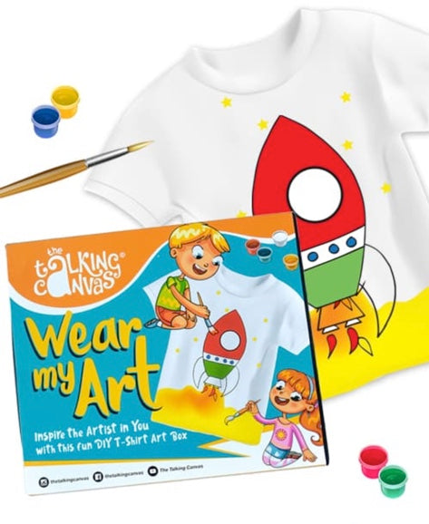 This DIY Art activity allows a child to learn to control paintbrush and learning to control paint will improve the hand-eye motor coordination. This kit is designed to encourage visualisation, creativity and curiosity through experiential design process and it also makes a perfect gift. Each “Wear My Art” DIY Activity Kit comes with age specific t-shirts for kids of multiple age groups to enjoy the design process. The practice sheet embedded in the kit helps kids jot their ideas down on it along with arriving at the right composition of design. It is important for parents to encourage kids to first use the practice sheet and support the visualisation process as it is the first step to understanding design. The Talking Canvas DIY Art Activity Kits are focused on developing important skills that encourage children to visualise, conceptualise, communicate and create design which they can proudly wear and flaunt. The fabric paints provided are of the highest quality and the colours